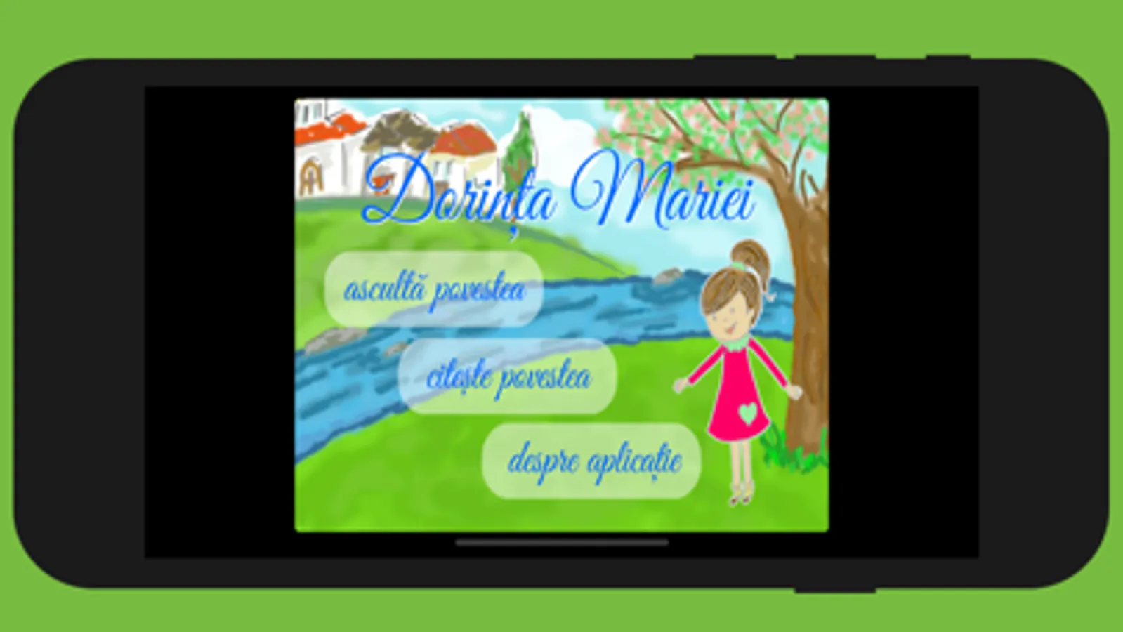 Aplicatia ofera doua posibilitati de parcurgere a povestii: audio, unde povestea este narata cu drag chiar de autoare si alta cu text, oferind varianta in care ii poti citi copilului tau aventura Mariei, inainte de culcare.