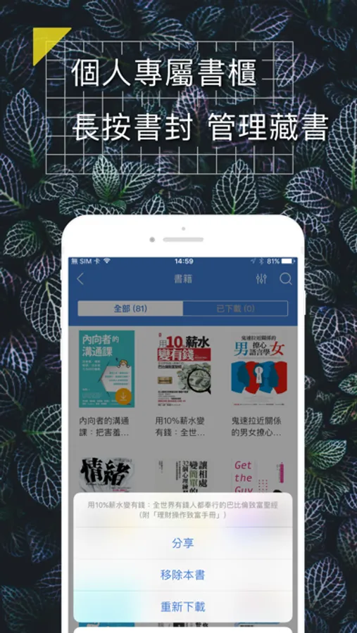 【書櫃管理】專屬書櫃管理藏書,長按書封即可移除檔案或重新下載。