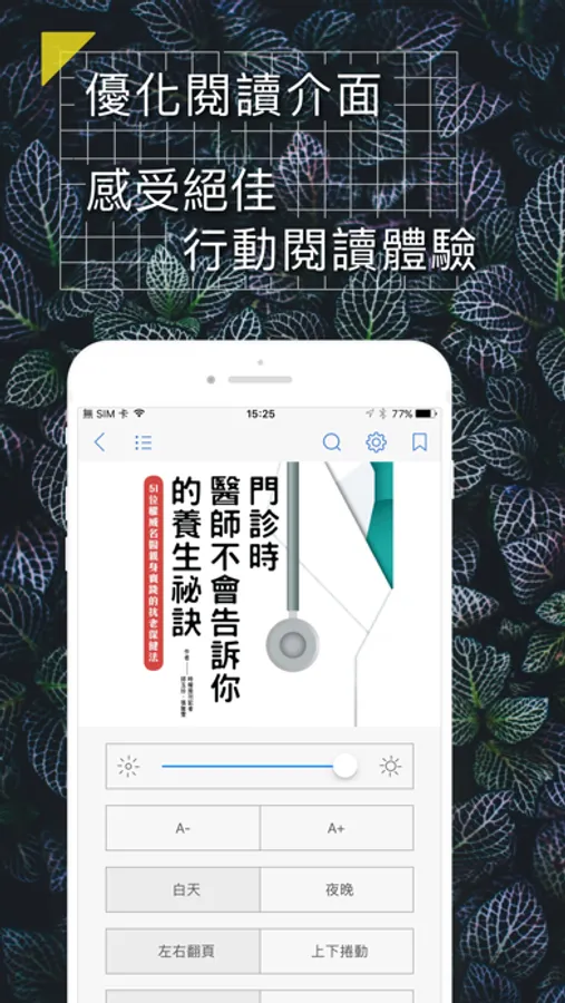 * ePub 3.0 格式/輸入關鍵字可全文檢索,提供劃線、螢光筆、筆記管理與匯出功能。可依喜好選擇「左右翻頁」或「上下捲動」閱讀模式,自由切換「白天」或「夜晚」閱讀情境。