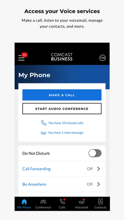 • View recent calls, listen to and manage voicemail, and customize greetings