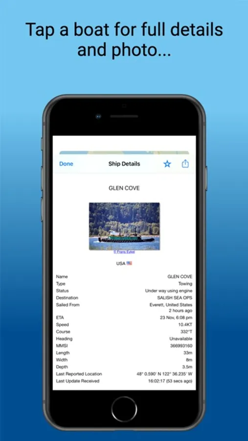 An optional In-App purchase even sends you alerts when a boat you track sets sail or arrives - perfect for people with loved ones at sea, for tracking ferries and rescue vessels - or following cargo across the world!