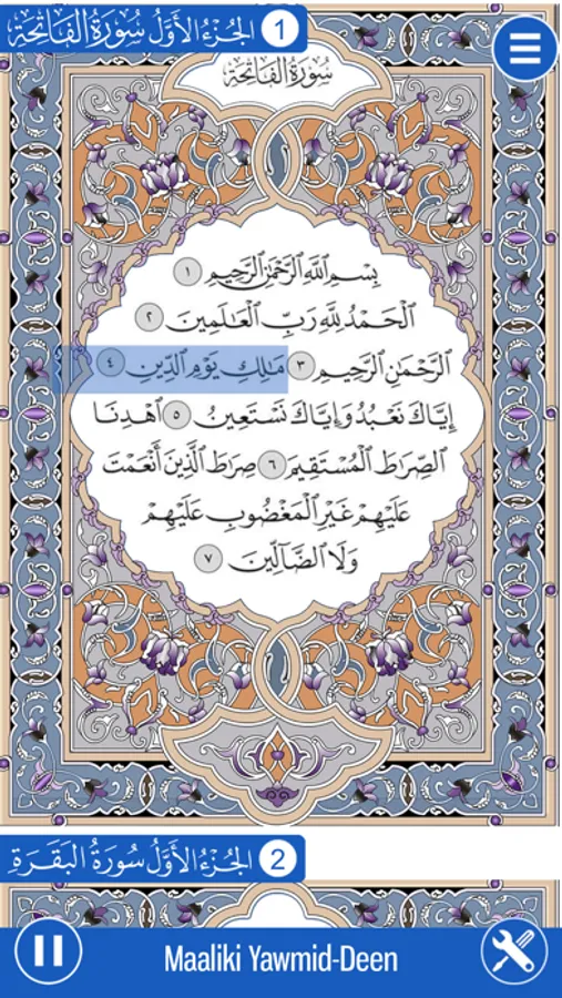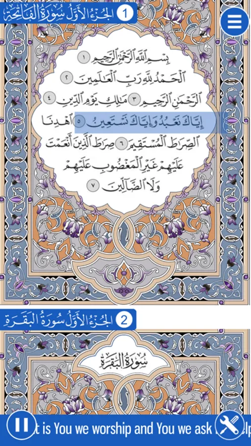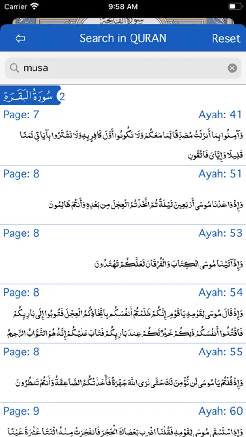 Surah Listing to quick jump to any Surah. Press i button with surah name to get list of all aya numbers in that surah and single tap to jump to specific ayah.