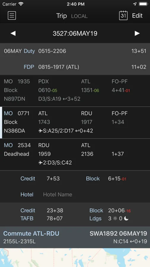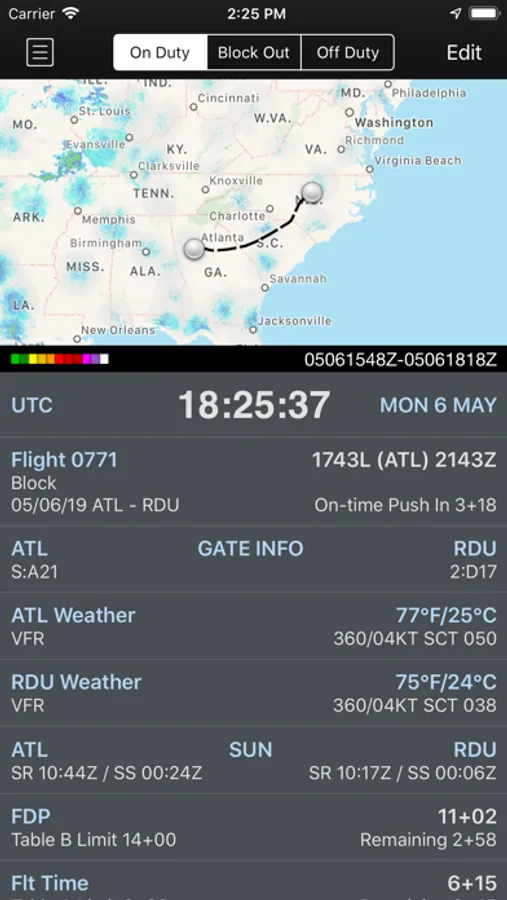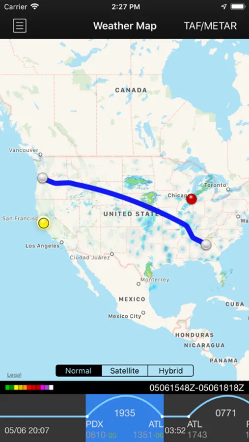 - Weather map with planned and actual overlays, tappable endpoints for weather and FAA delay info