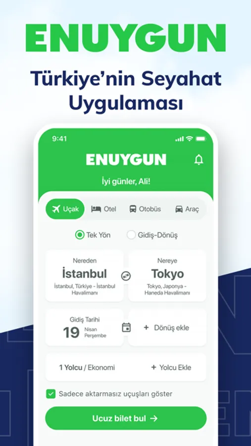 ENUYGUN offers its users any flight ticket, bus ticket, hotel reservation, and car rental services in a single application.