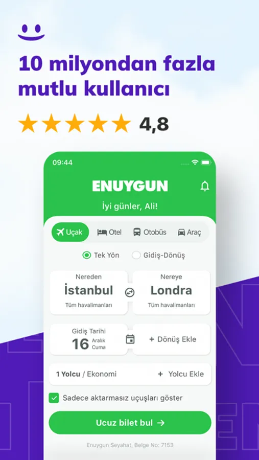 ENUYGUN allows you to list, compare, and book easily domestic and international flight tickets, bus tickets, hotel reservations, and car rental services from many companies with your credit or debit card, just in seconds.