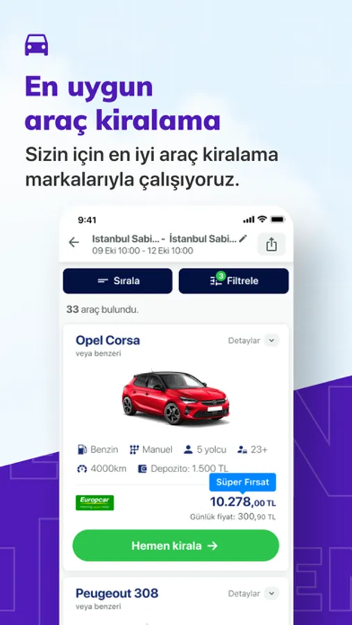 You can use ENUYGUN for car rental services to complete your transaction without being directed to different websites. You can compare offers from more than 70 car rental companies such as Green Motion, Garenta, Sixt, Europcar, and Rentgo, while easily selecting rental car that suits your budget by filtering according to your preferences.