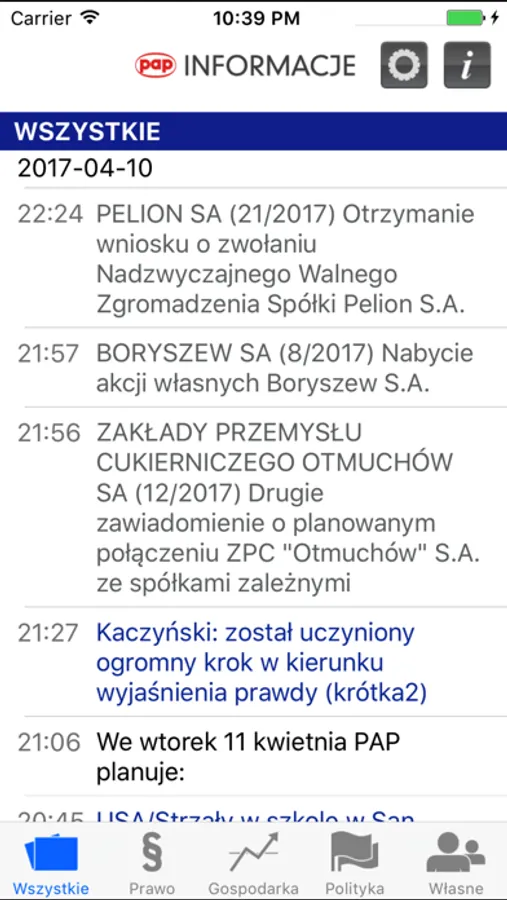 Informacje PAP – Aplikacja służąca do wyświetlania wybranych informacji z Codziennego Serwisu Informacyjnego Polskiej Agencji Prasowej. Aplikacja sama synchronizuje się z serwisem PAP i na bieżąco pobiera aktualne wiadomości, istnieje również możliwość ustawienia komunikatu o pilnej depeszy w formie powiadomień. Użytkownik może wyświetlić cały strumień depesz PAP lub tylko wybrane lub definiowane przez siebie kategorie np. polityka, edukacja, gospodarka, sport, zdrowie, kultura, etc. W aplikacji można zobaczyć depesze maksymalnie z 7 ostatnich dni.