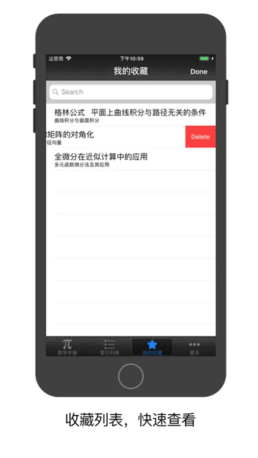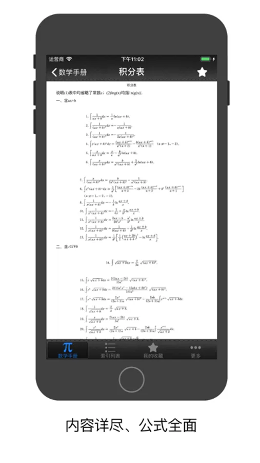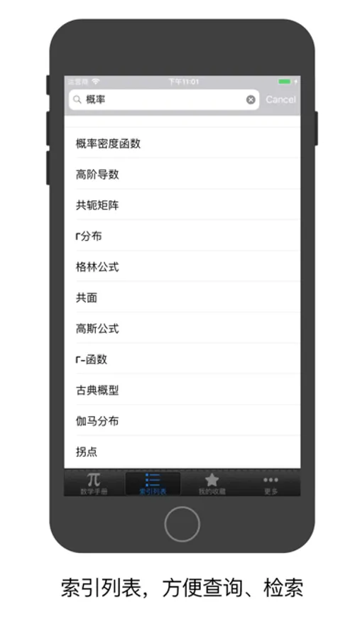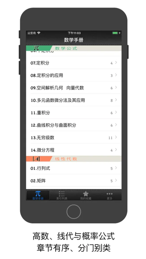 《数学公式定理手册》每一部分内容都根据章节分类,并且包括知识点索引,可以查询和收藏。是您考试的好帮手。