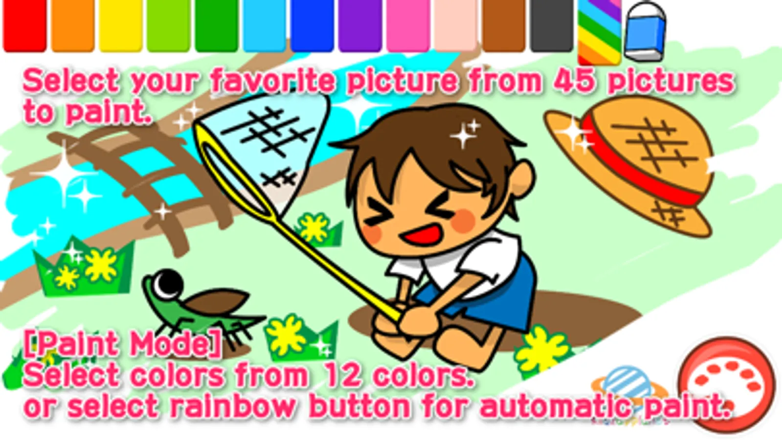 Select the rainbow color button and rub the screen, and you can change the colors automatically and paint the picture like the one in a picture book.