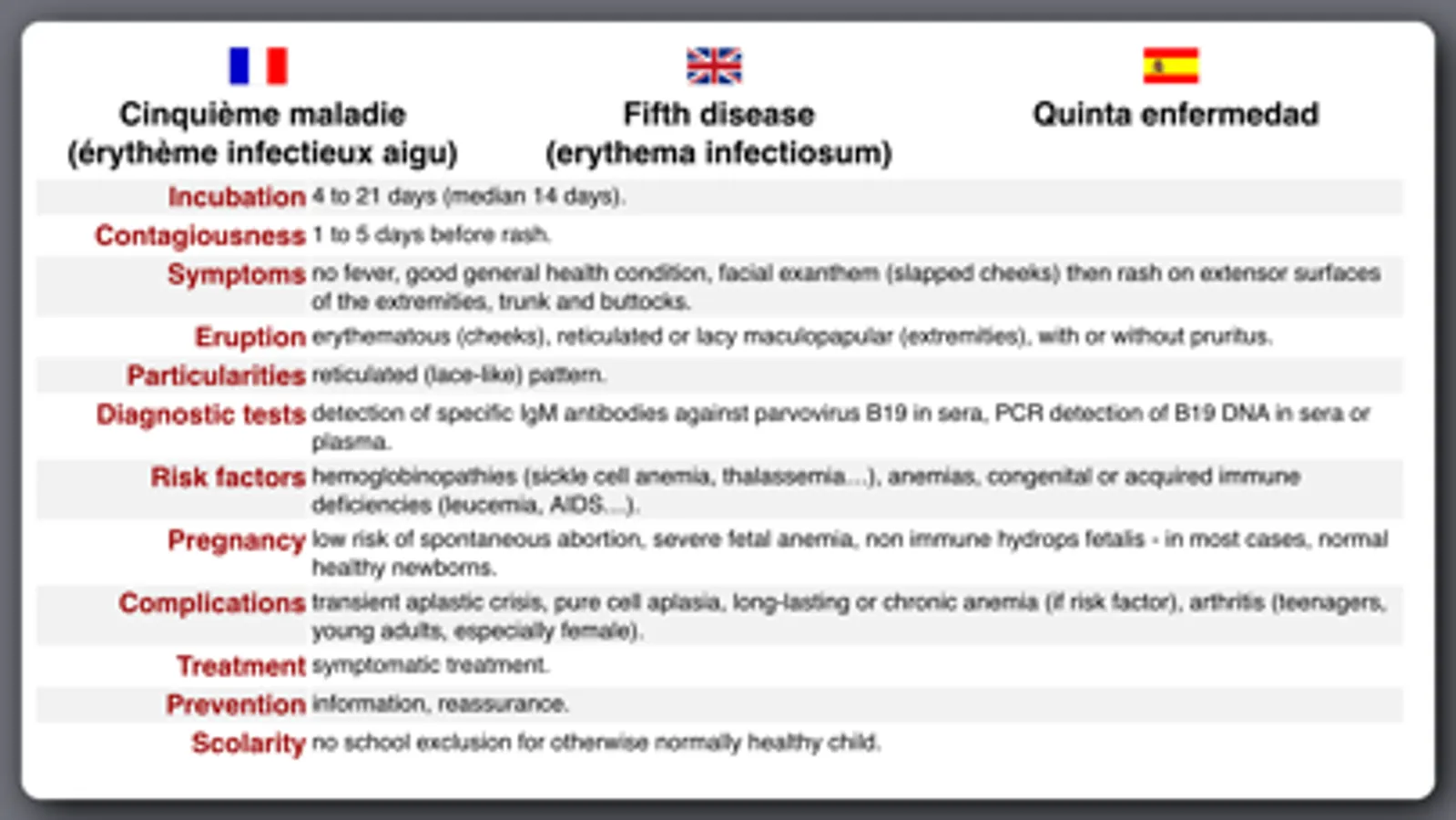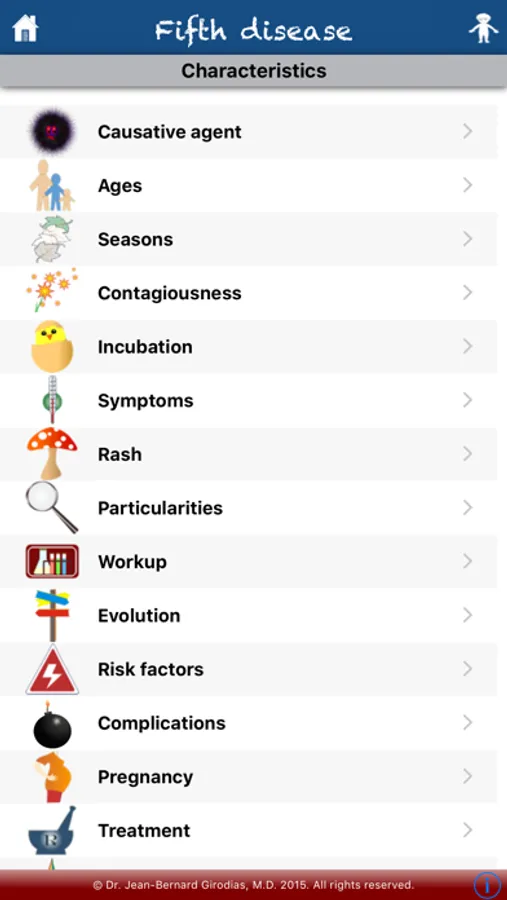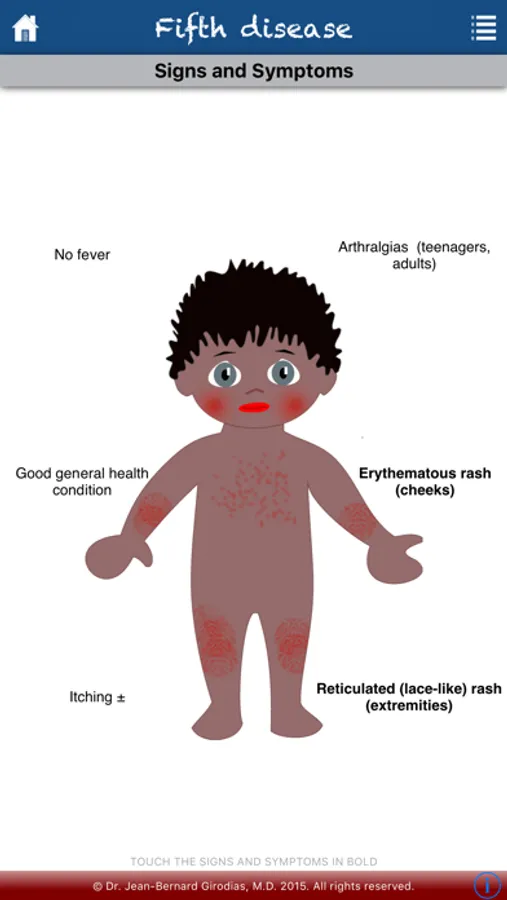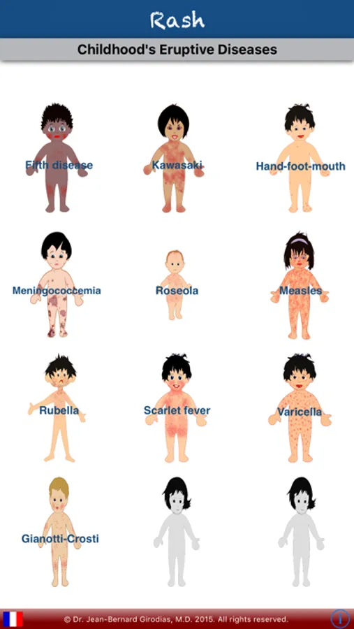 This application is an educational tool and memory aid. It has the essential characteristics of the main eruptive childhood diseases: gianotti-crosti, measles, scarlet fever, rubella, fifth disease, roseola, chicken pox disease, hand-foot-mouth disease, meningococcal purpura and Kawasaki disease. It provides useful information on their care, treatment and preventive measures.