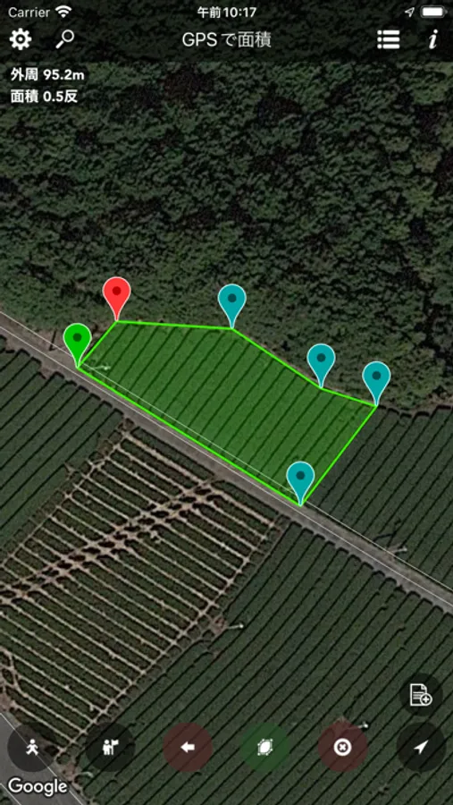 ・左下のボタンは左から『トラッキング』『現在地にマーク』『ひとつクリア』『面積を計算』『全てクリア』です。
