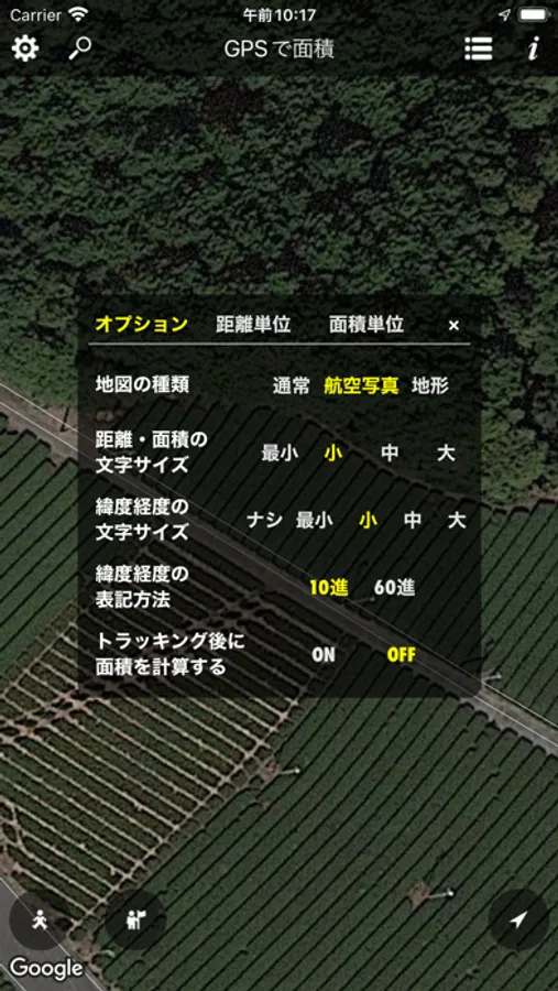 ・オプションボタンで面積の単位及び距離の単位を変更できます。