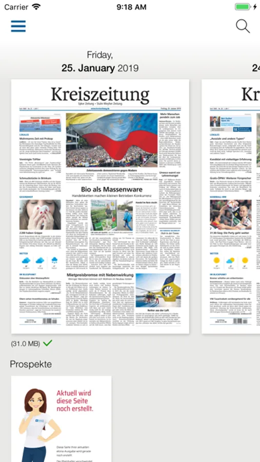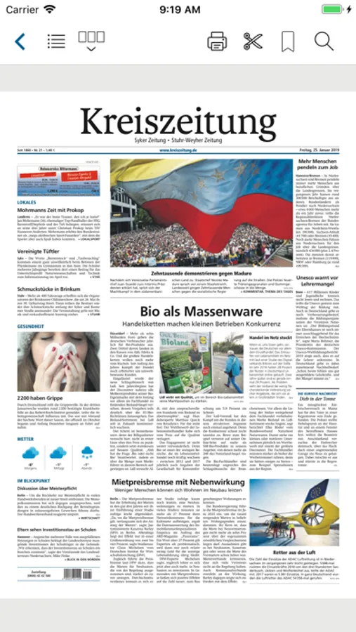 Mit der MK elona App stehen Ihnen alle Ausgaben der Mediengruppe Kreiszeitung – mit allen Inhalten der gedruckten Zeitung – als digitale Version zur Verfügung. Kaufen Sie Einzelausgaben und Monatsabos Ihrer Lokalzeitung direkt in der App oder melden Sie sich mit Ihren gültigen Zugangsdaten an und lesen Sie Ihre abonnierte Ausgabe.