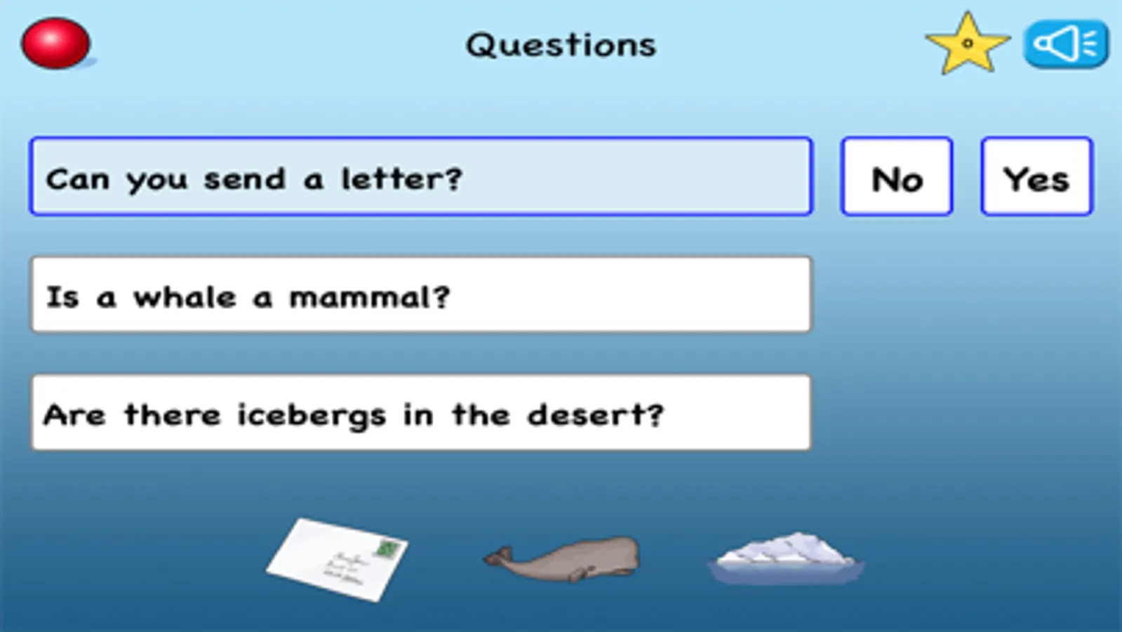 Answer the questions in different statements. The sentence will be read out loud. Click on the buttons to answer. The pictures on the bottom of the screen will help you to find the right answer.