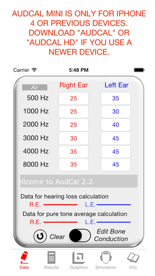You can use AudCal mini with the data obtained from a pure tone audiometry or use a simulated audiometric test performed with your iPhone. A pure tone synthesizer is built-in with AudCal mini. NEVER use the simulated audiometric test with diagnostic purposes.