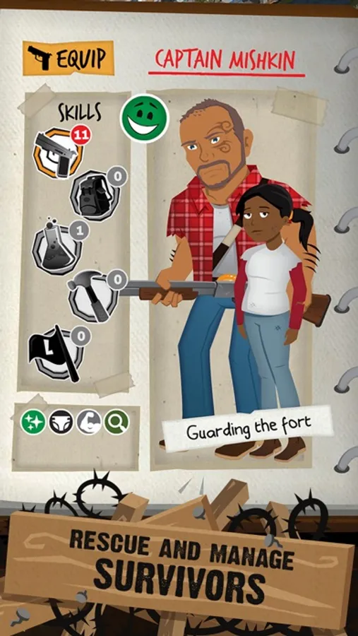 - 5 skills: defense, leadership, scavenging, building, engineering