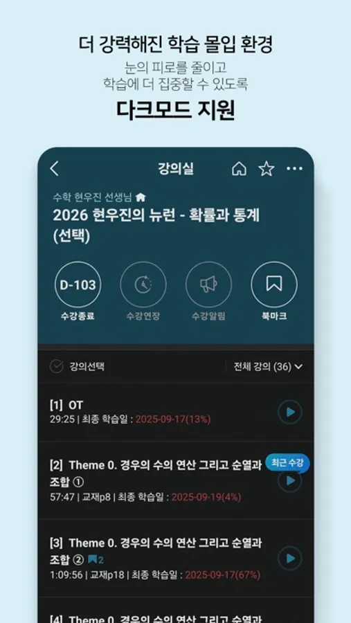 눈의 피로를 줄이고 학습에 더욱 집중할 수 있도록 다크모드 지원