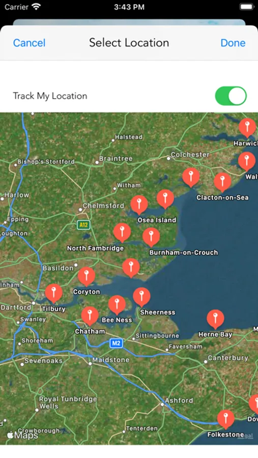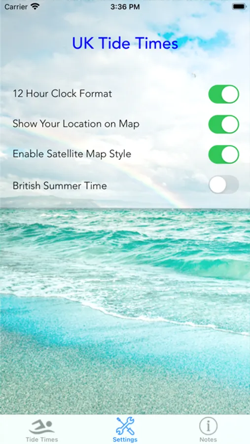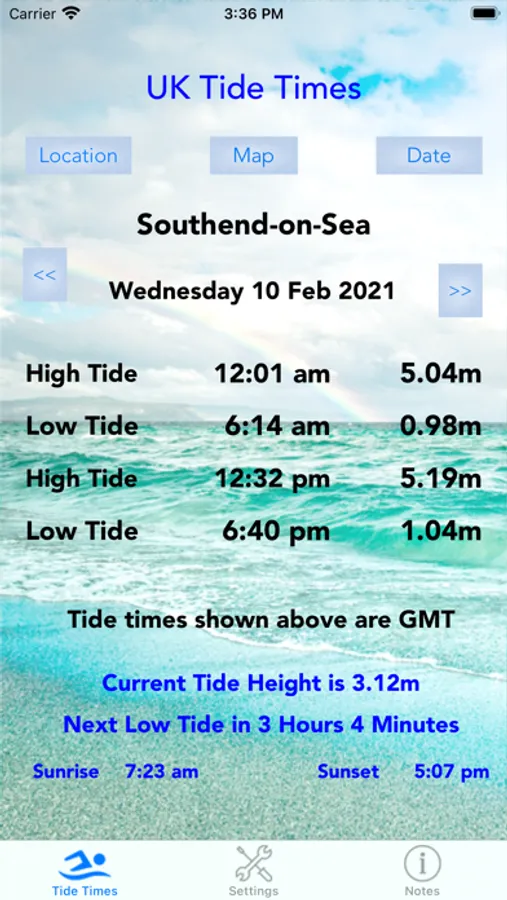Track the tide times for England, Wales, Northern Island and Scotland, including Bognor Regis, Bournemouth, Brighton, Bristol, Clacton-On-Sea, Dover, Folkestone, Hastings, Ipswich, Liverpool, London Bridge, Lowestoft, Newquay, Southampton, Southend-On-Sea, Swanage, Torquay, Cardiff, Swansea, Belfast, Dundee, Inverness, Peterhead, St Kilda, Isle of Man, Greenock & Abersoch. In total 226 locations throughout the country are covered. Displays the low and high tides for the day, allowing selection of any date through to December 2023. It also shows the current tide height and the time to the next tide. The map uses your GPS to make it easier to select the port to display. No internet connection is needed for the tide times although the maps do require data to display. The sunrise and sunset times for the port selected are also shown.