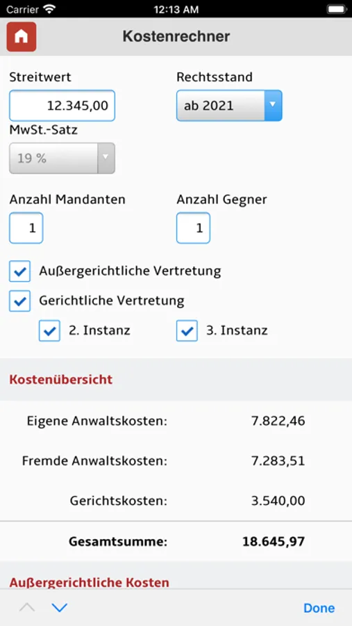 Die App enthält 800 wichtige Gesetze und Verordnungen des Bundes in den aktuell gültigen Fassungen, das Deutsche Anwaltsblatt in der jeweils aktuellen Ausgabe und einen RVG-/GKG-Gebührenrechner, der Anwalts- und Gerichtskosten wahlweise nach altem oder neuem Gebührenrecht ab 2021 berechnet.