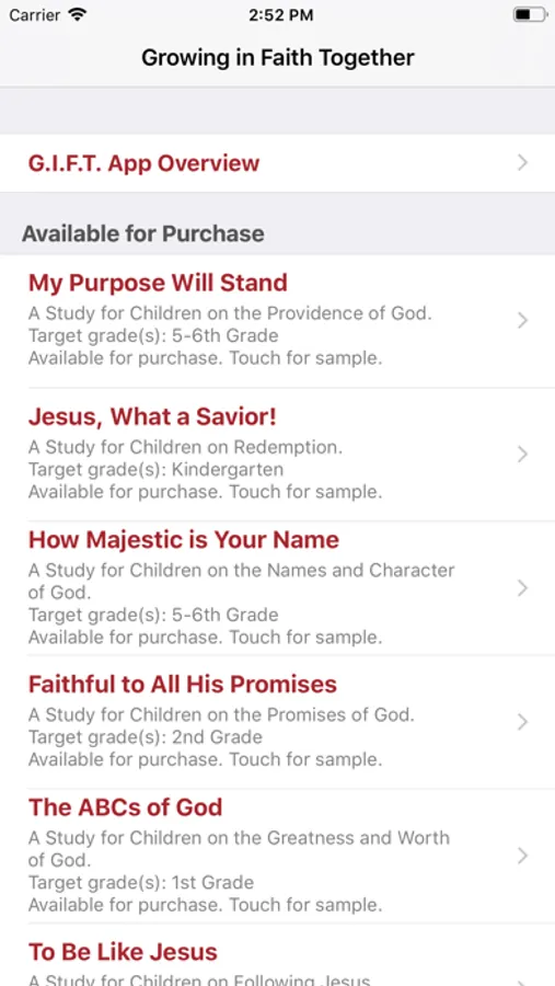 Note: This GIFT App is a free viewer. Please enjoy reading the curriculum overviews and GIFT Page samples for Lesson 1 of each curriculum title. Each $1.99 in-app purchase provides GIFT Pages for one curriculum (40 lessons). In-app purchases are not compatible with Family Sharing.