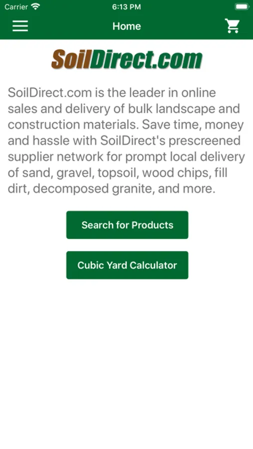 Soildirect.com official app. This app lets you purchase materials for your next job or home improvement project from this app. Ordering is fast and easy. We have even included a cubic yard calculator for your convenience to determine how much material you will need for your project. Try us out and see how we can save you time and money $$$