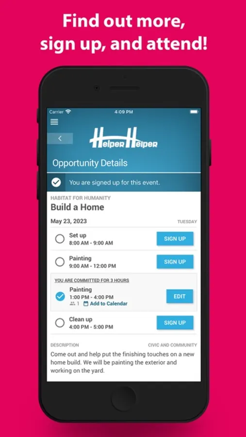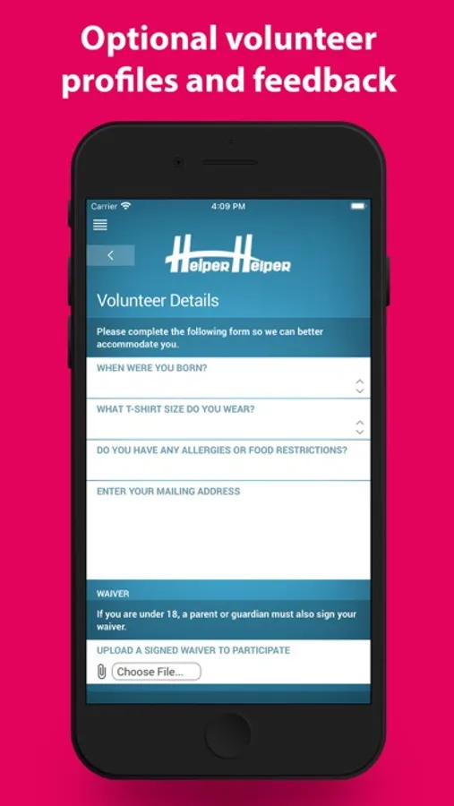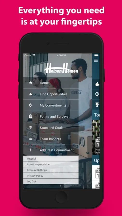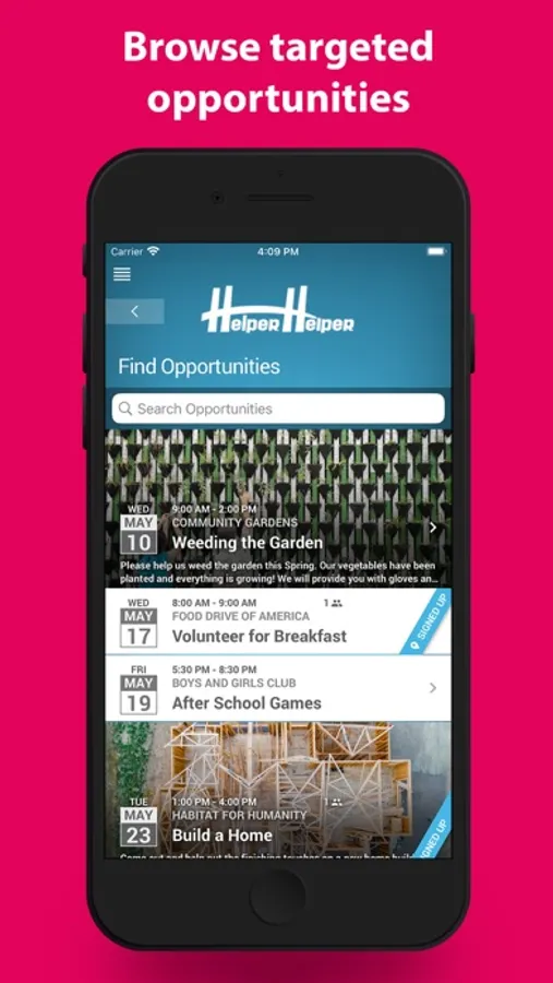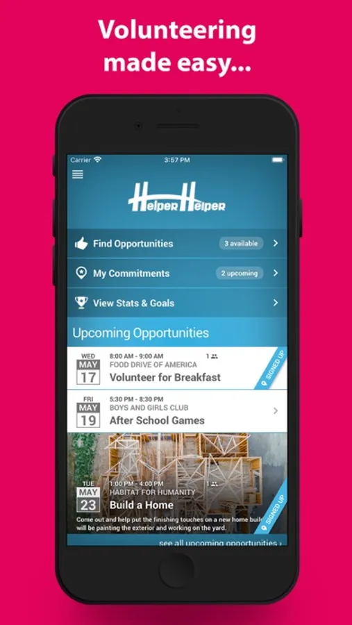 Helper Helper is a community service app that connects volunteers to meaningful experiences in the community. Helper Helper simplifies the organizational efforts for volunteer coordinators and helps volunteers easily find and schedule events.