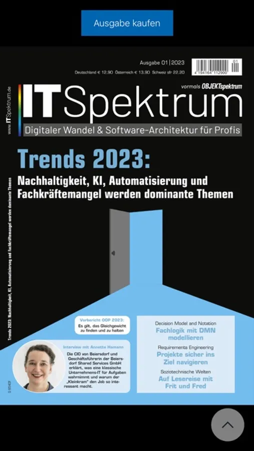 ITspektrum liefert zuverlässige Hintergründe, Trends und Erfahrungen zu Software-Management, -Architektur und –Engineering. Es informiert, wie mit Hilfe moderner Softwaretechnologie technische und finanzielle Vorteile realisiert werden können. Die Redaktion prüft alle eingereichten Beiträge auf Qualität und Relevanz und garantiert so, dass die Lesererwartungen nach Qualität und Neutralität erfüllt werden.