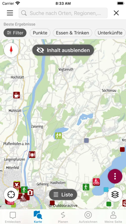 - Filterung nach Sportart/Schwierigkeit/Strecke/Höhenmeter/Dauer oder per Kartenansicht. Nach Eigenschaften wie "familienfreundlich", „Rundtour“ oder "Einkehrmöglichkeit" etc. eingrenzbar.