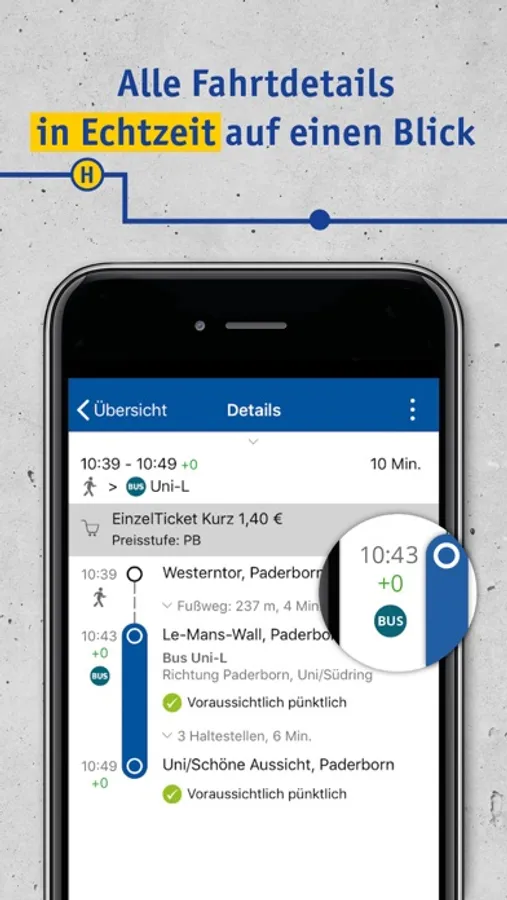 Schnell, flexibel und durch den elektronischen Kauf sparst du beim EinzelTicket rund 20 Prozent. Über die Fahrplan-App hast du im Stadtgebiet Paderborn (Preisstufe PB) die Möglichkeit folgende Tickets digital zu kaufen: Kurzstrecke, Kurzstrecke Kind, EinzelTicket, KinderTicket, 24-Stunden-Ticket PB und FamilienTagesTicket. Die Tickets können sowohl per Direktkauf oder aber aus der Fahrplanauskunft heraus gekauft werden.