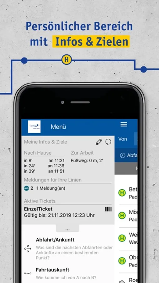Der persönliche Bereich stellt sicher, dass Sie die Busverbindungen, die Sie am häufigsten nutzen, immer im Blick haben: Daten, Haltestellen und Orte, die hier hinterlegt werden, können individuell an die eigenen Bedürfnisse angepasst werden.