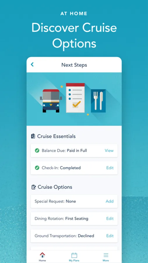 When you’re at home and preparing to sail: Plan your ideal vacation, make payments, use My Online Check-In, explore and book activities, add our Protection Plan, ground transportation, change dining Seating and make special requests regarding dietary needs, accommodations for little ones, celebrations and more.