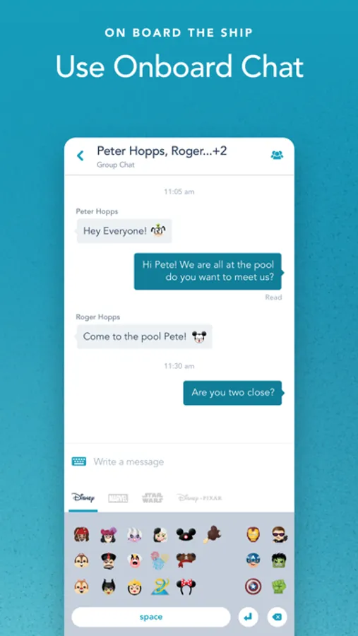 · While aboard your cruise, chat one-to-one, or with multiple friends and family members at once.
