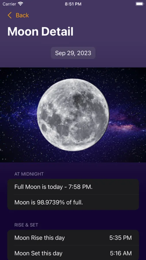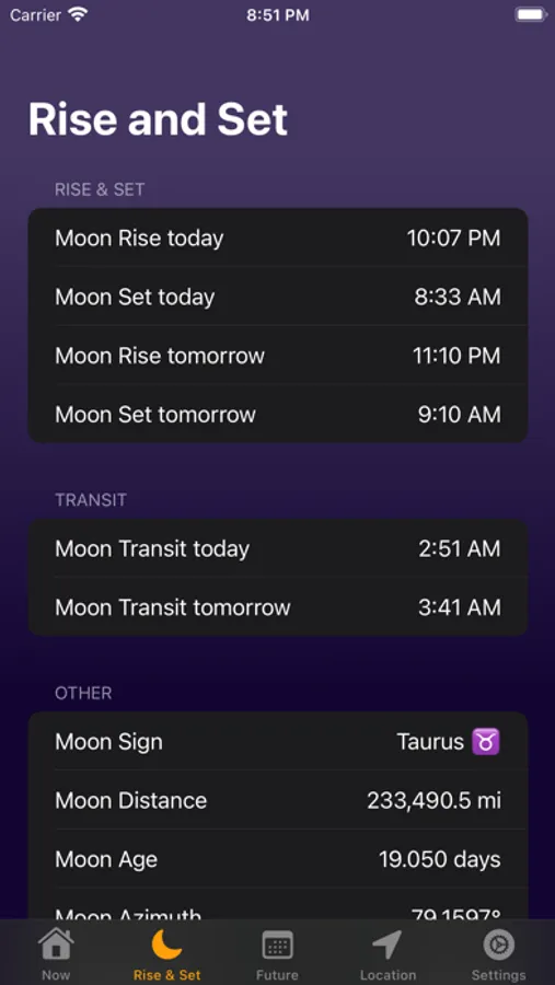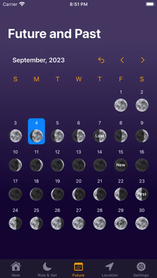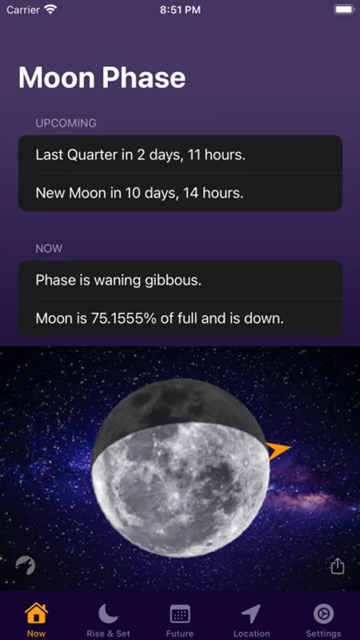Live by the moon! See the phases of the moon in clarity - for where YOU are now - not just the "nearest city". See a countdown to the next phase of the moon TO THE MINUTE, whether full or new, first or last quarter. See a current simulation of the moon as it appears to you - for now or any day in the past or future - on a large, simple, easy to read display. See Moon Rise and Set times - so you can plan your lunar activities. This IS the app you are looking for!