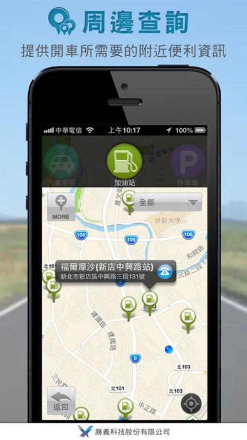 周邊查詢:提供出門遊玩可能會需要用到的景點位置,找尋加油站和便利商店不必再靠運氣。