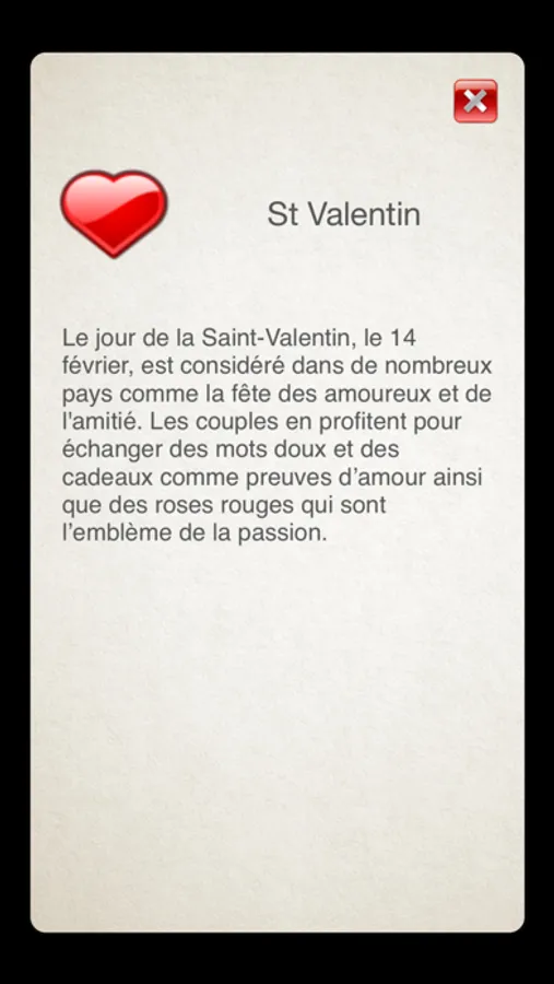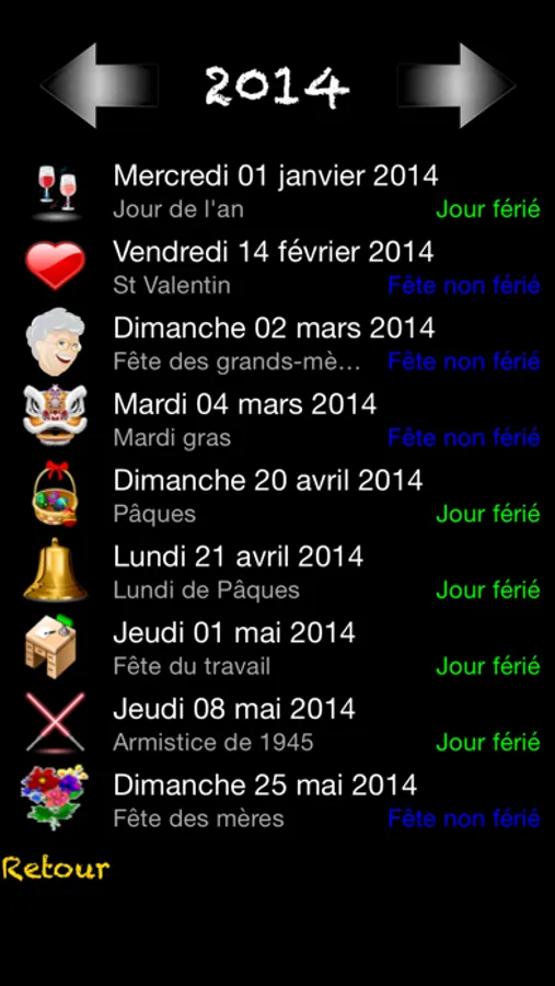 Une liste de tout les jours de l'année est consultable avec les détails de chaque jour qui s'affichent lorsqu'on le sélectionne.