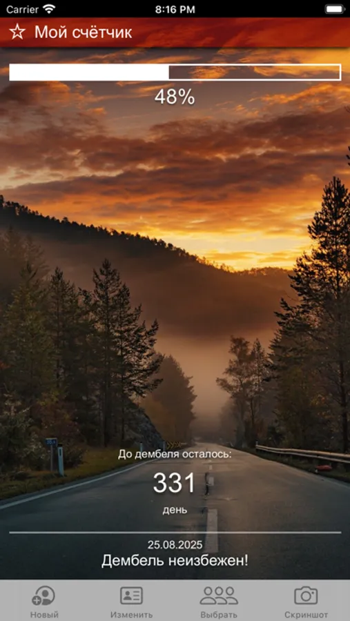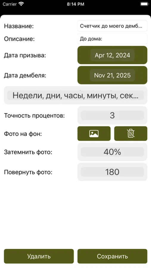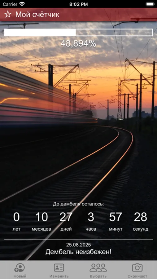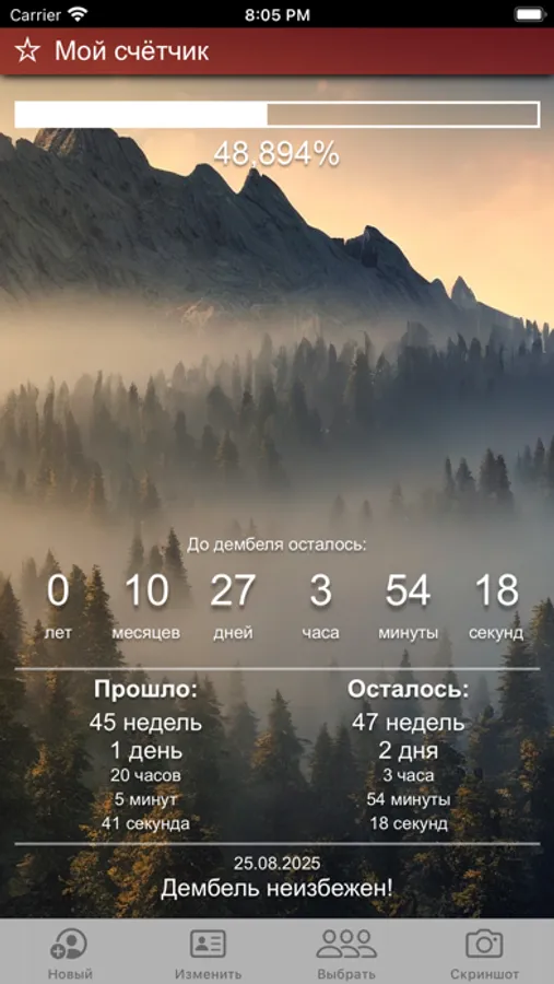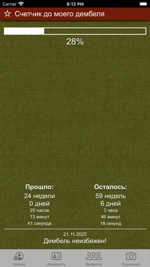 Простой и удобный таймер, который отображает сколько процентов службы в армии позади, а также сколько осталось служить в годах, месяцах, неделях, днях, часах, минутах и секундах. Чтобы запустить таймер, нужно просто указать дату призыва и дату демобилизации.