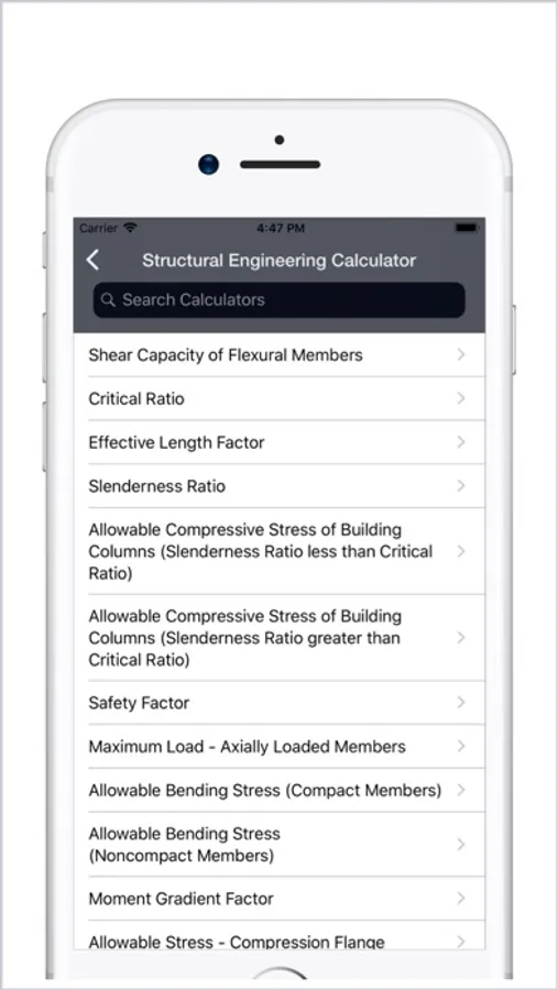 STRUCTURAL : • Shear Capacity of Flexural Members • Critical Ratio • Effective Length Factor • Slenderness Ratio • Allowable Compressive Stress of Columns (Slenderness Ratio (lesser) Critical Ratio) • Allowable Compressive Stress of Columns (Slenderness Ratio greater than Critical Ratio) • Safety Factor 8.Maximum load - Axially Loaded Members • Allowable Bending Stress (Compact Members) • Allowable Bending Stress (NonCompact Members) and more... up to 58 Calculators.