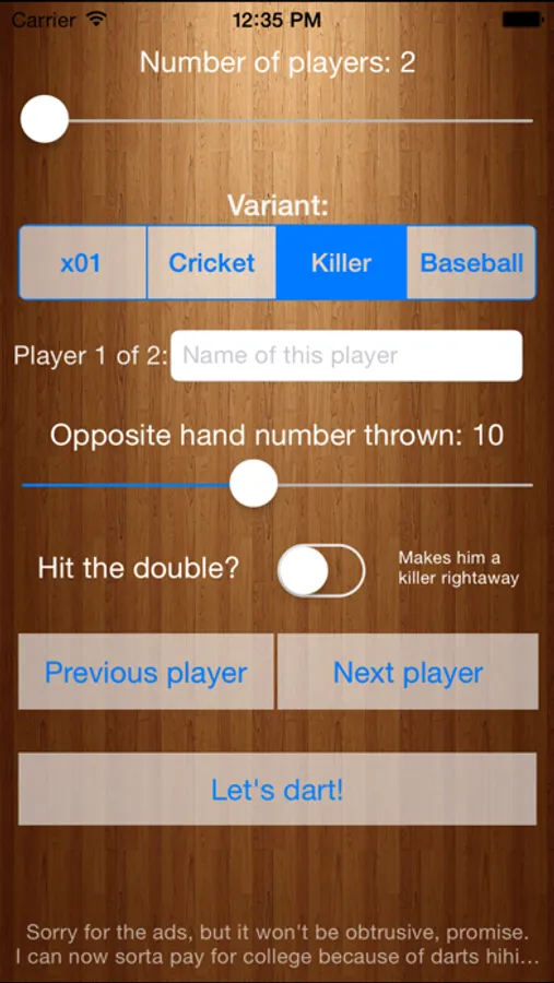 Variants that are supported are the "regular" x01 games, Cricket, Killer and Baseball. If you would like to see more variants or would like me to fix anything, just shoot me a message.