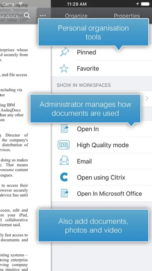The AsdeqDocs solution is installed on premises, behind the corporate firewall and directly connects a mobile employee with more than 18 leading document management solutions including SharePoint, Trim, Documentum, Exchange, File Shares, OpenText, WebCenter and IBM Connections.
