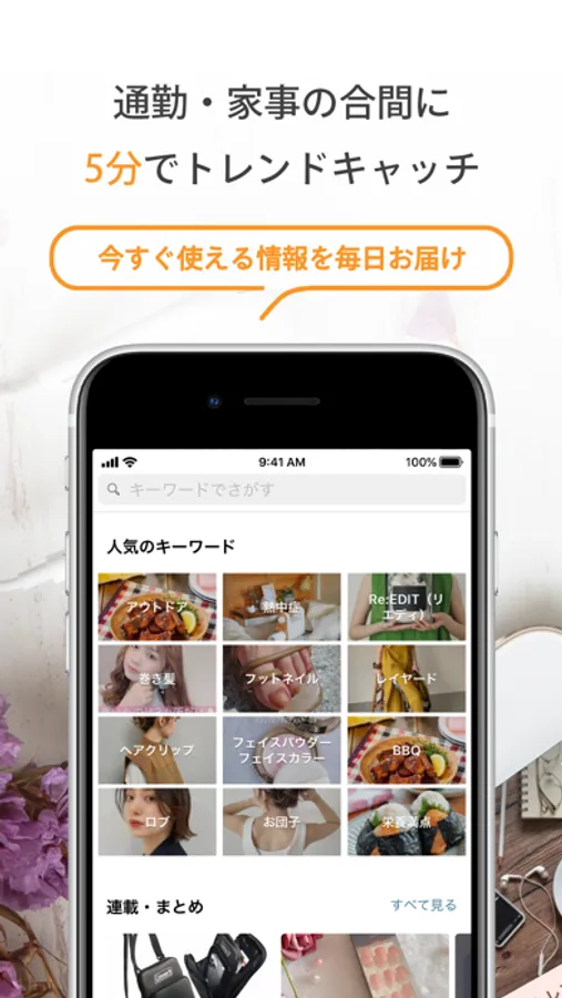 プチプラアイテムの通勤コーディネート、おしゃれな宅飲みレシピ、家事が楽になるテクニック、忙しい朝でもできる簡単ヘアアレンジ、動いても崩れにくいママ向けヘアスタイル、自宅ででできるエクササイズなど、各シーン毎に活用できるお手軽な情報が豊富にあります。