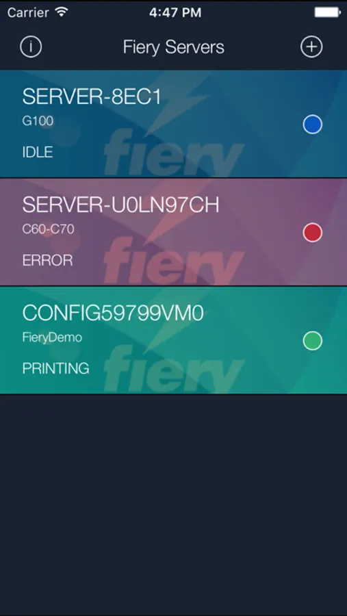 Fiery Go allows you to monitor the status of multiple Fiery Driven™ printers and manage print jobs from anywhere. Using Fiery Go, you can import jobs and perform multiple job actions like printing, deleting, previewing*, and defining job attributes. The app alerts you about consumable status, errors in the print job, paper jams and more, so you can take immediate action. Easy to learn and use, Fiery Go gives you more flexibility and allows you to multi-task for a more efficient workplace and higher productivity.