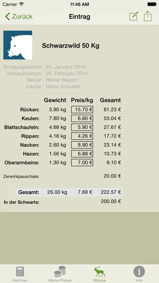 - Wildbret kann abgespeichert werden mit Erlegungsdatum, Verkaufsdatum, Revier, Käufer, eigenen Notizen, den Gewichtsanteilen, den Preisen