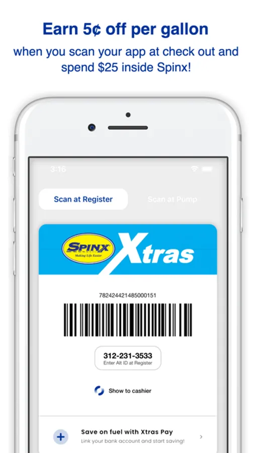 The Spinx Mobile app is convenient and easy. Create an account using your Spinx Xtras card to unlock exclusive offers and savings right at your fingertips. Use the app to earn and redeem rewards, view your rewards balance and get exclusive offers picked just for you! Also, you can easily pay with the app inside the store or at the pump.