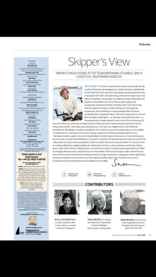 Sailing Today is the essential monthly magazine for thousands of active cruising sailors whose love of sailing takes them around the British Isles, across the Channel or further, to the blue waters of the wider world. Featuring new and used boat tests, interviews with cruising enthusiasts and expert assessments of the latest equipment, Sailing Today is the first choice for any cruising sailor in search of really relevant information on how to sail better.