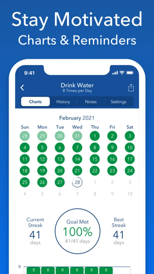 - Charts with history, streak, success rate and more