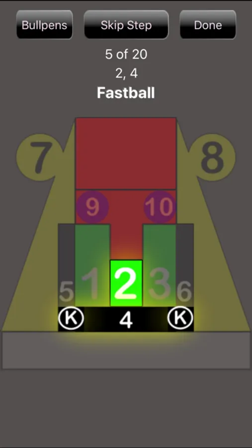 Once a pitcher creates a profile and selects a bullpen to throw it's time to play ball. The target screen will display the pitch number in the sequence, what Lokations to aim at, and which pitch to throw. Below this information a Lokator Target will have targeted zones highlighted making visualization and communication easy for the scorekeeper.