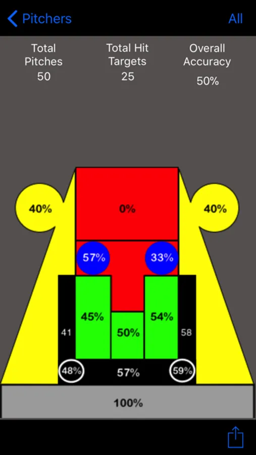 When the bullpen has been completed, statistics in four categories are automatically stored in the App database. Two of the categories use the Lokator Score to judge effectiveness and rank each pitcher according to targets hit and the number of pitches it took to hit each target. The remaining two reports are Accuracy Reports. The first one gives a percentage of total targets hit for each individual bullpen and the other gives percentages of hits for each individual target of the Lokator design.