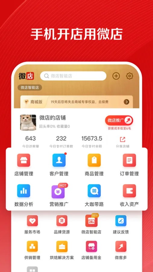 微信开店就用微店,满足您在小程序、朋友圈、公众号、视频号、支付宝、企业微信等多平台多场景开店经营,统一管理,多渠道引流卖货,9000万微店店主的共同选择!
