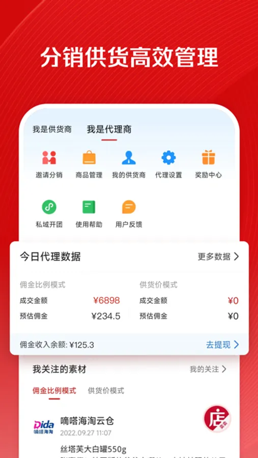 海量优质低价货源,一键分销,轻轻松松赚提成,多种分销模式灵活丰富的分销工具,快速扩大店铺经营模式