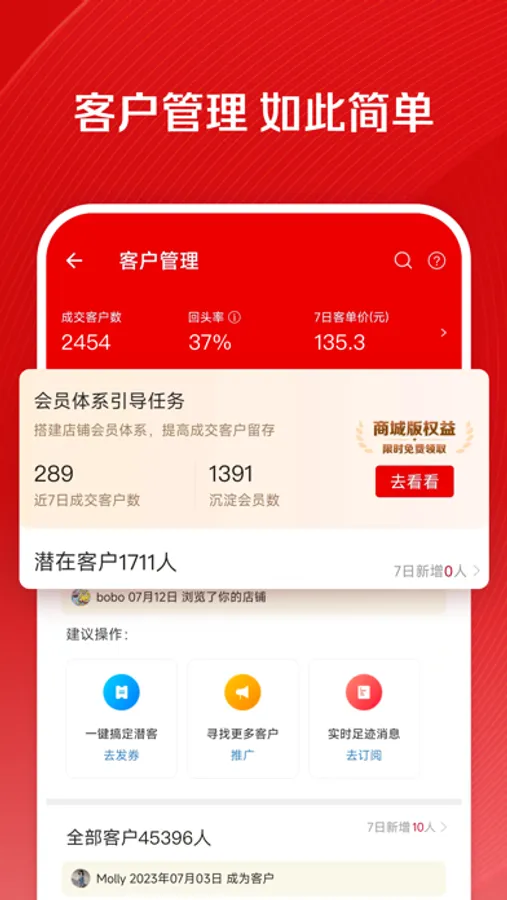 客户精细化分群、客户人群运营、全店自动推券、会员周期升级、会员场景营销升级、人群画像,多种运营工具,助力商家智能运营客户